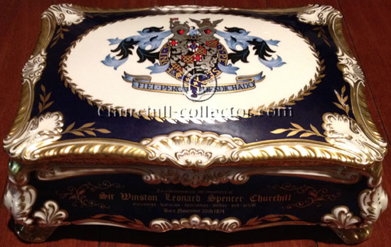 Elaborately trimmed in gilt and ormolu, the lid bears Churchill’s coat of arms in colour. On the sides are gilt drawings of Chartwell and Blenheim, speech quote and commemoration. In an handsome fitted brown case.