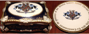 The Plate (Smith P 82, Carmichael 42) also has the colour coat of arms in the center. 10.5″ diameter in the original fitted box.