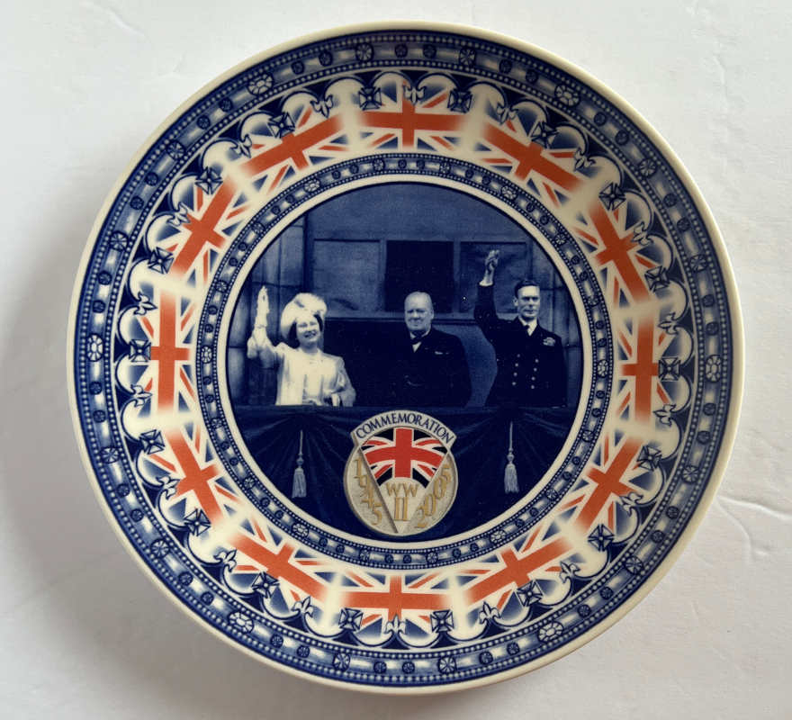 WWII Commemoration plate showing Churchill between King George the VI and the Queen consort Elizabeth (later the Queen mother) on the balcony at Buckingham Palace.