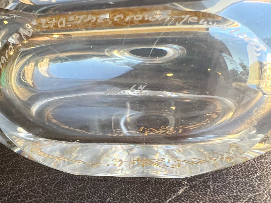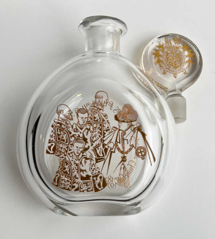 This lead crystal decanter produced in a limited edition of 100 made by Orrefors for Garrard & Co. is No. 64. Gilt-engraved, depicting Churchill as a Knight of the Garter & flanked by four heralds surrounded by these words: