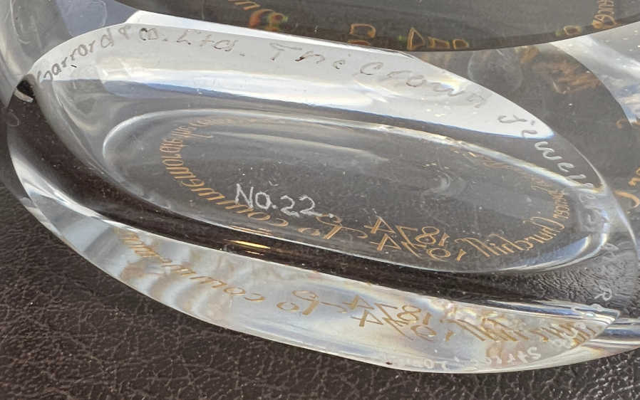 Foot: Engraved. “Garrard and Co Limited. the crown jewellers 112 Regent Street London W1. No 22”