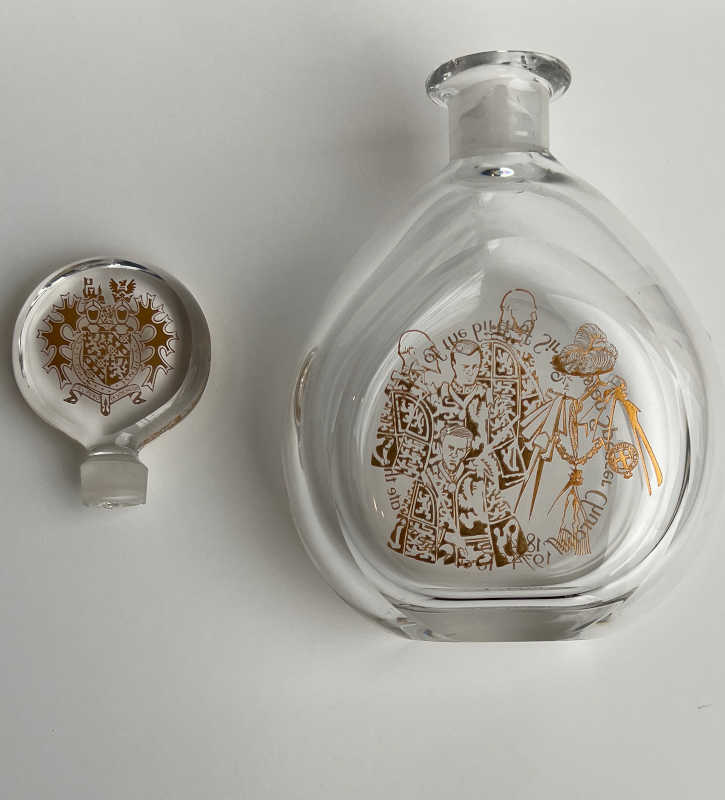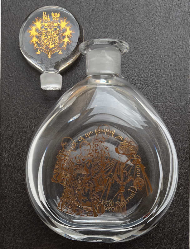 This lead crystal decanter produced in a limited edition of 100 made by Orrefors for Garrard & Co. It is gilt-engraved depicting Churchill as a Knight of the Garter, flanked by four heralds with the legend ‘To commemorate the centenary of the birth of Sir Winston Spencer Churchill 1874-1974’. The base is etched “Garrard & Co. Ltd. The Crown Jewelers, 112 Regent Street, London W1“, “No. 22”. The stopper bears the Churchill coat of arms. Without the presentation case.