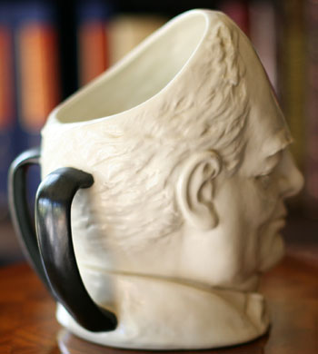 This was the first Doulton Jug modeled after a contemporary personality and the first character jug to be discontinued. Color is an off white (cream) with two black handles.