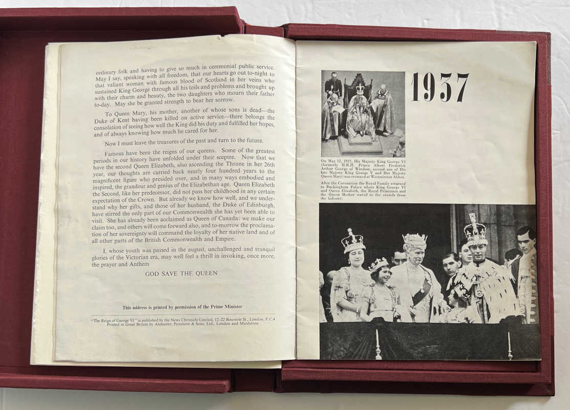 Also included is a copy of the Reign of King George which includes the Churchill address, published by New Chronicle Ltd London, containing many photographs of King George VI.