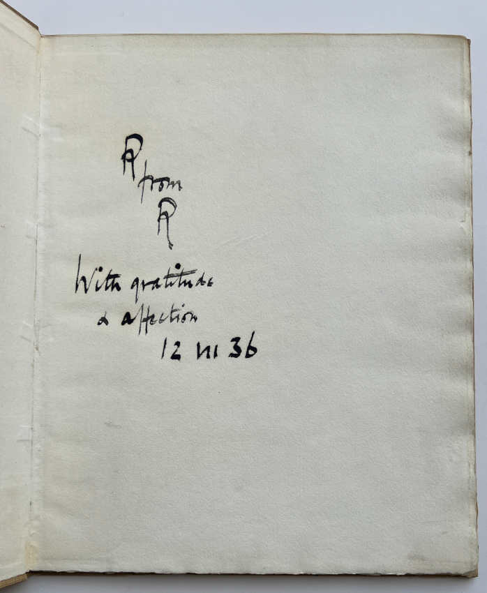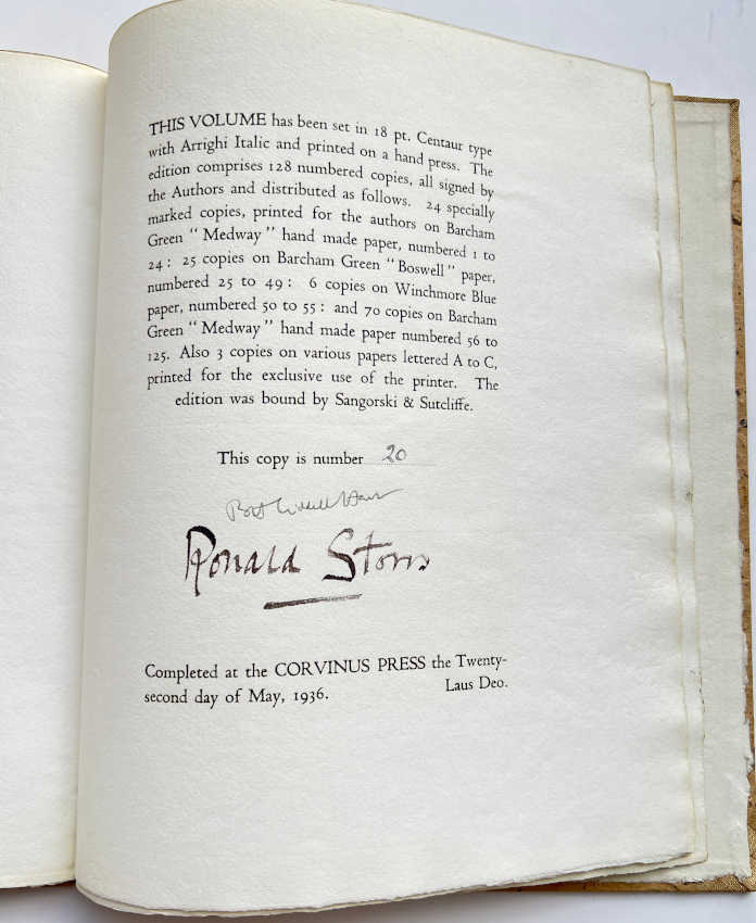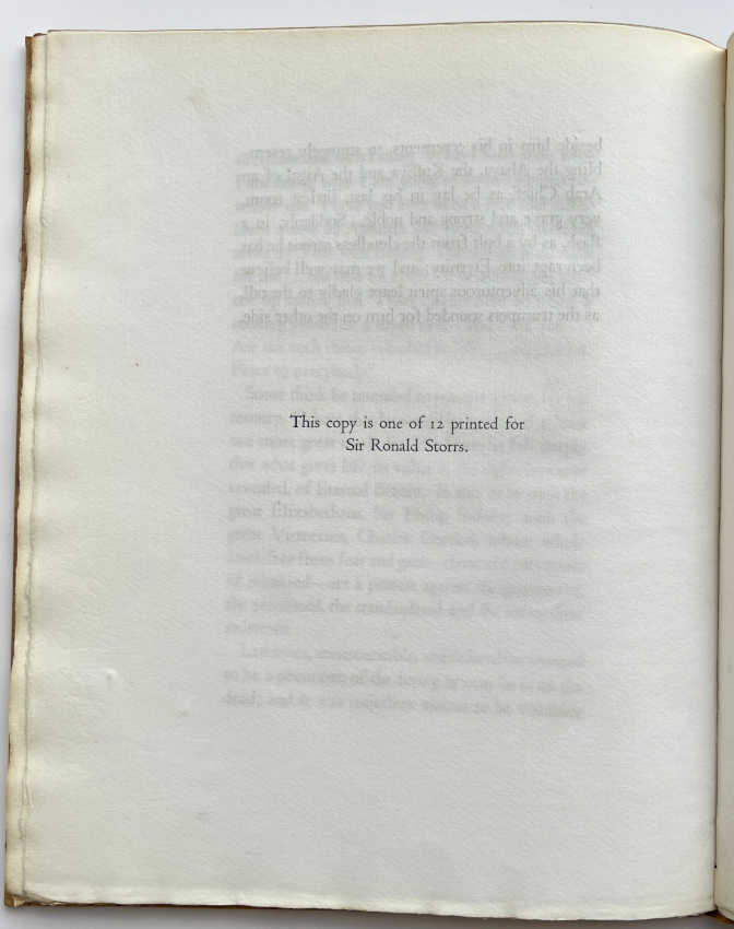 Signed limited edition, number 20 of 24 copies, which were printed on Barcham Green “Medway” hand-made paper. 12 copies were printed for Sir Ronald Storrs (13 – 24) and 12 copies for Basil Liddel Hart (1 – 12) and all 24 copies were signed by Ronald Storrs and Liddel Hart (out of a total edition of 128).