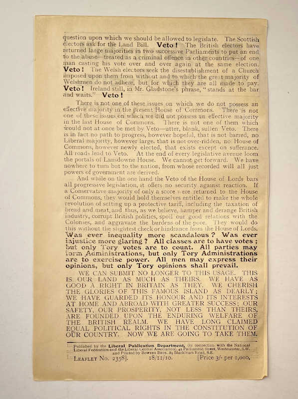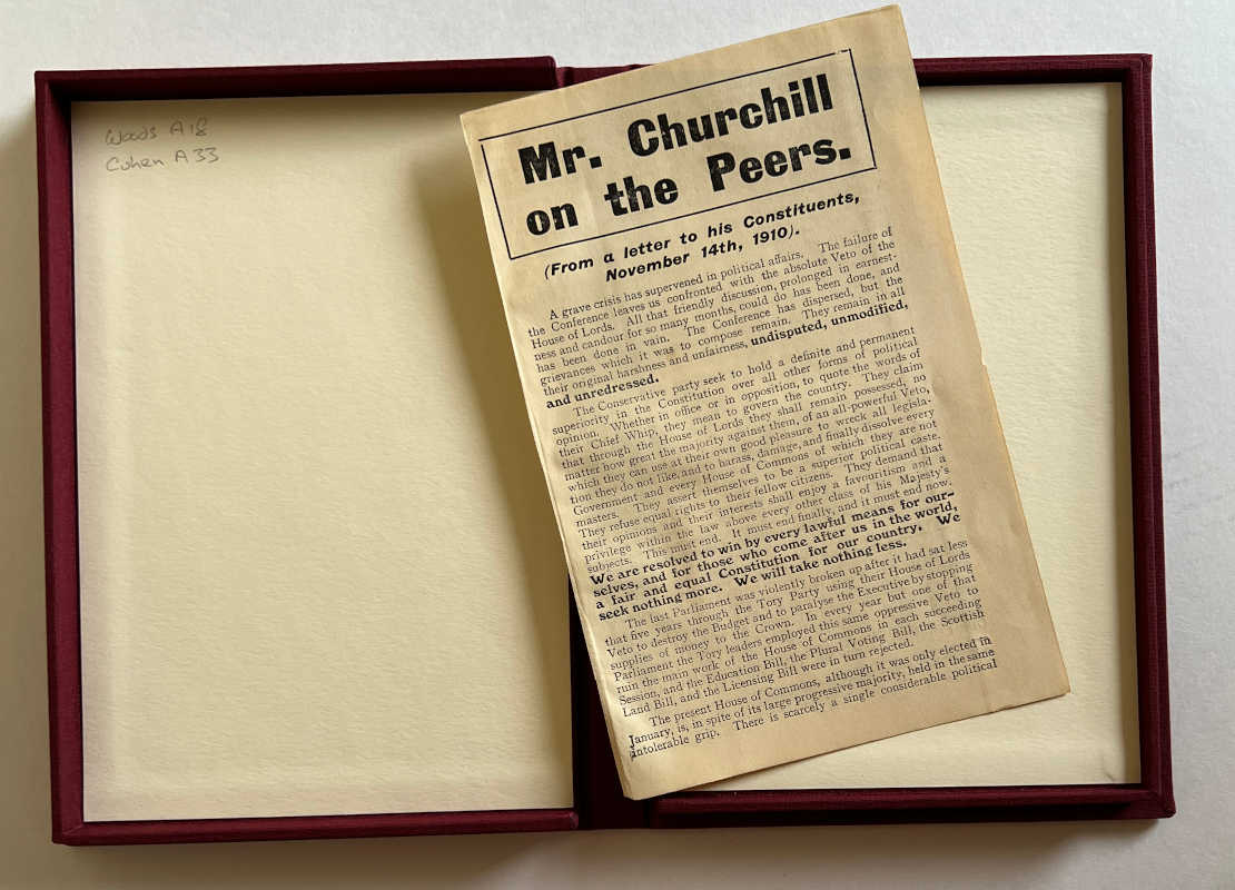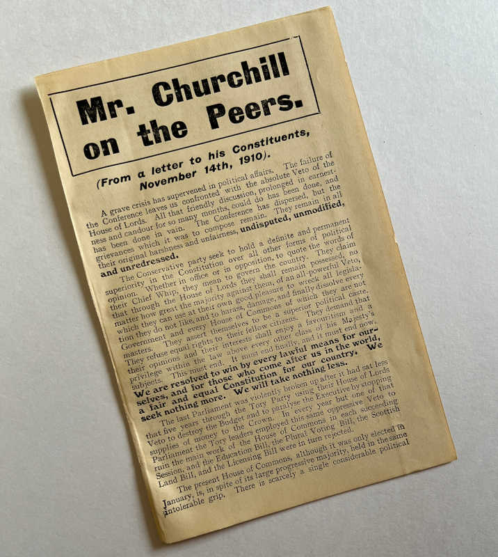 This is a First Edition (and the only edition) of Churchill’s campaign literature during the second 1910 general election, opposing the House of Lords veto.