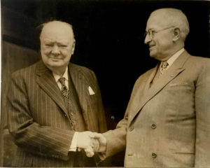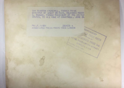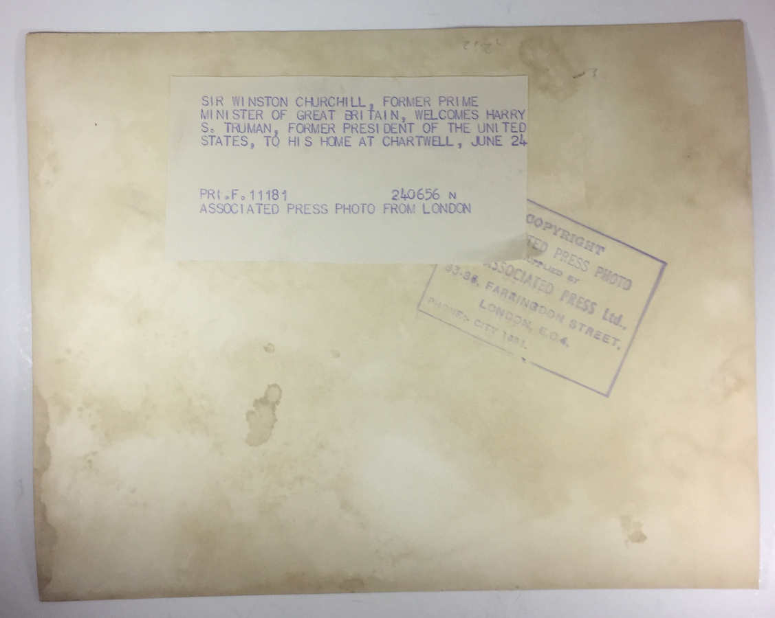 “SIR WINSTON CHURCHIL, FORMER PRIME MINISTER OF GREAT BRITAIN, WELCOMES HARRY S. TRUMAN, FORMER PRESIDENT OF THE UNITED STATES, TO HIS HOME AT CHARTWELL, JUNE 24”.