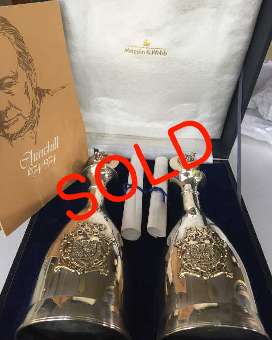 A magnificent commemorative set. Two sterling silver & gilt decanters with stoppers in original presentation case with Certificates of Authenticity signed by Clementine Churchill. (facsimile signature)