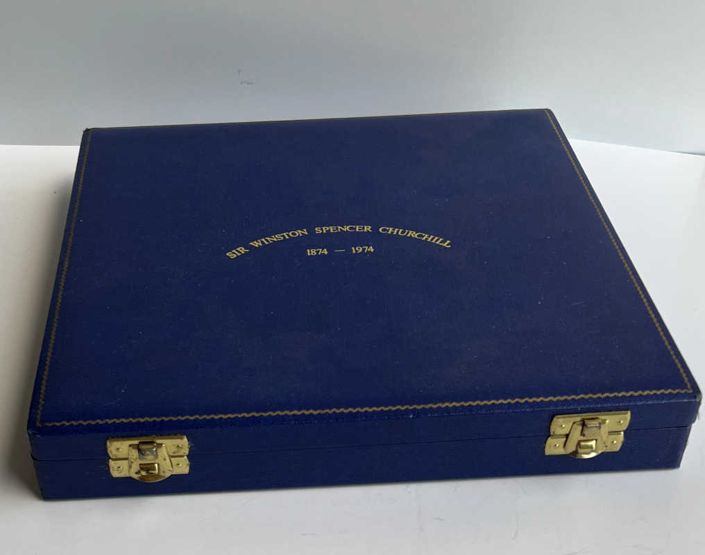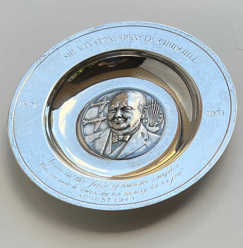In the center is an embossed plaque of Churchill with RAF spitfires and paint brushes. Engraved around the rim: