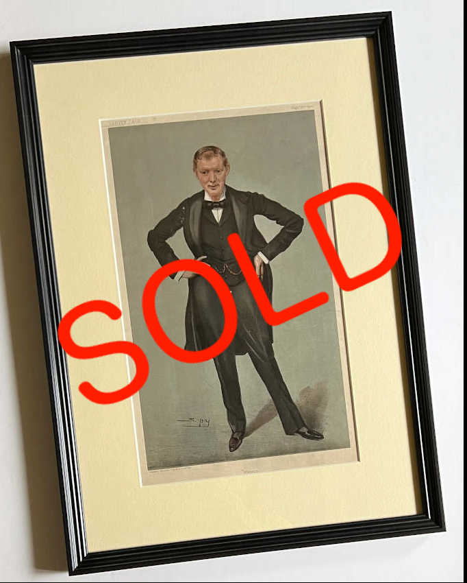 A much sought after chromolithograph print from Vanity Fair, over 100 years old, shows an image of a young Churchill with hands on hips. This print has been newly framed under conservation grade UV protective glass.