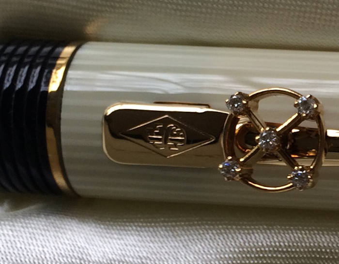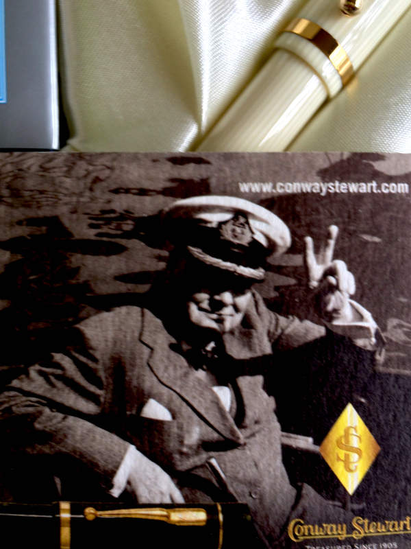 Conway Stewart Churchill Fountain Pen in case in ivory . Attached to the clip is an after-market ship’s wheel in gold with diamonds depicting Churchill’s association with the Navy.